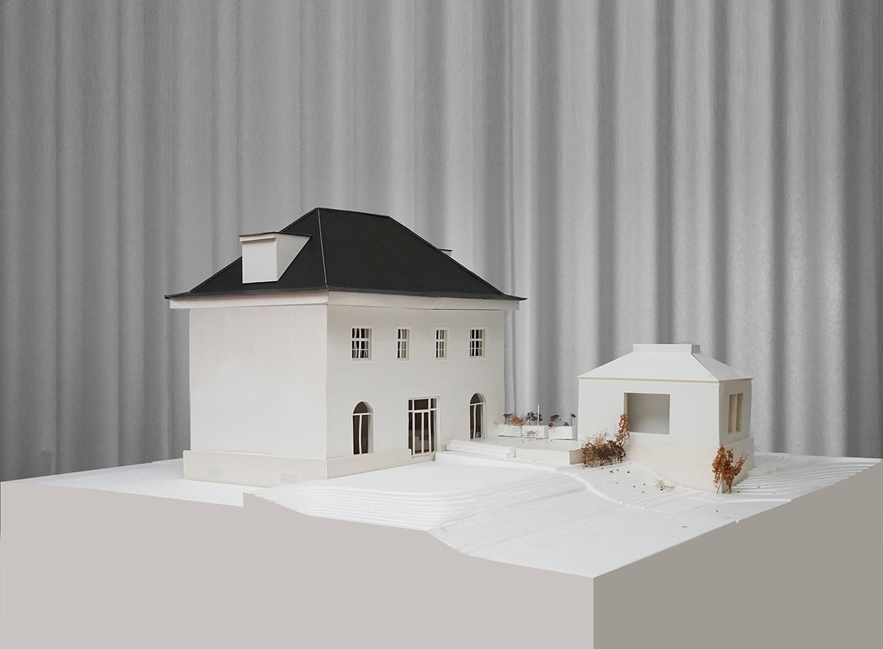 Ziel des Projektes ist die Erweiterung eines freistehenden Einfamilienhauses. Der zweigeschossige Putzbau mit Walmdach wurde 1928 errichtet und steht zurückgesetzt mit seiner Nord- und Ostseite zu den angrenzenden Straßen hin orientiert. Der Entwurf sieht einen kleinteiligen, subtilen Umgang mit Flächen und Volumen vor. Ein Teil des Sockelgeschosses des Bestandsgebäudes wird nutzbar gemacht, indem das Gelände an der Ostfassade modelliert und abgesenkt wird. Der Boden des Sockelgeschosses wird partiell abgesenkt, um eine lichte Raumhöhe von 2,70 m zu erhalten. Zusätzlich wird über einen Verbindungsbau das Sockelgeschoss mit einem zweigeschossigen Baukörper verbunden. Dieser zeichnet sich entsprechend im Erdgeschoss eingeschossig ab und ergänzt den Altbau optisch spielerisch um einen weiteren freistehenden Baukörper. Durch seine Fassadenöffnung nach Osten und Süden kehrt der neue Baukörper im Erdgeschoss dem Bestand und seiner Gartenfläche den Rücken zu. Insgesamt ermöglicht der Entwurf, die Gartenfläche des Gebäudes in maximaler Größe zu erhalten.