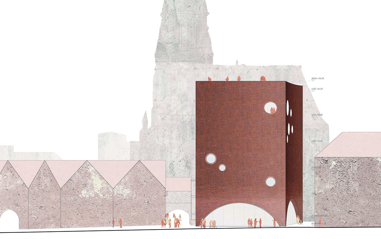 Stralsund mit dem Ozeaneum oder Rostock mit dem archäologischen Landesmuseum: die Hansestädte haben für ihre Museumsbauten prägnante Standorte am Hafen gewählt. Die Entscheidung für einen Museumsneubau am Schlachtermarkt in Schwerin bietet die Chance, diesen abseits der Touristenströme gelegenen und dennoch zentralen Stadtraum besser ins städtebauliche Geflecht einzubinden. Der Baukörper des Museumsneubaus vermittelt seine Bedeutung durch seine prägnante Silhouette aus gebogenen Backsteinwänden über den Platzraum des Schlachtermarkts hinaus in die Stadt und reiht sich in die Skyline der Wahrzeichen Schwerins ein.