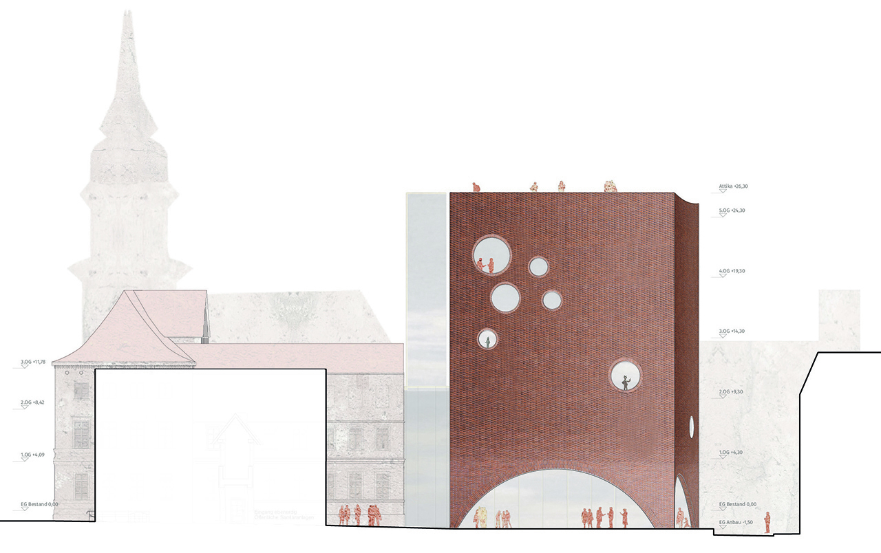 Die Verbindung mit dem bestehenden denkmalgeschützten Gebäude erfolgt behutsam und respektvoll. Das Gebäude tritt als markanter Solitär hervor und ist durch seine Form unverwechselbar. Der Turm aus recycelten Backsteinen fügt der von den gotischen Kirchen Schwerins gebildeten Stadtsilhouette einen neuen Hochpunkt hinzu. Der südliche Flügel wird, den Bestand fortschreibend, aufgestockt. Neubau und Bestand stehen frei nebeneinander. Zum Schlachtermarkt entsteht so eine klare Dominante, die über die Materialität die Verwandtschaft zu den Kirchen und qualitätvollen Gebäuden des frühen 20. Jahrhunderts sucht. Die Schwere der klassischen Mauerwerkstektonik wird durch den leichten Schwung der Fassade aufgelöst. Mit den Bogenstellungen im Erdgeschoss öffnet sich das Gebäude zum Stadtraum und erinnert an das benachbarte Rathaus. Die Fenster stellen Bezüge zu den Figurennischen der Gotik her. Vitrinenfenster mit vergrößerten Repliken von Ausstellungsstücken geben von außen einen ersten Einblick auf die Sammlung. Große Ausblickfenster beziehen markante Stadtansichten in die Ausstellung ein. Die Oberlichter im Treppenraum spiegeln die umlaufende Erschließung auf der Fassade wider. Im Zusammenspiel der Öffnungen ergibt sich eine fein abgestimmte Komposition.